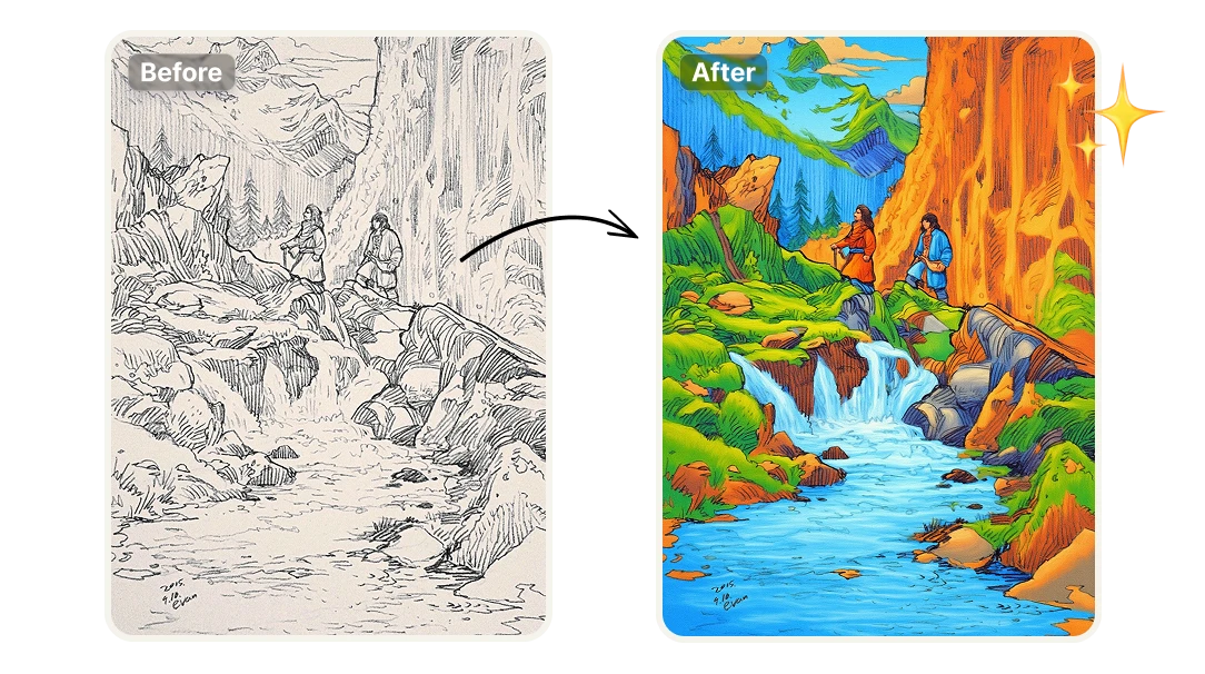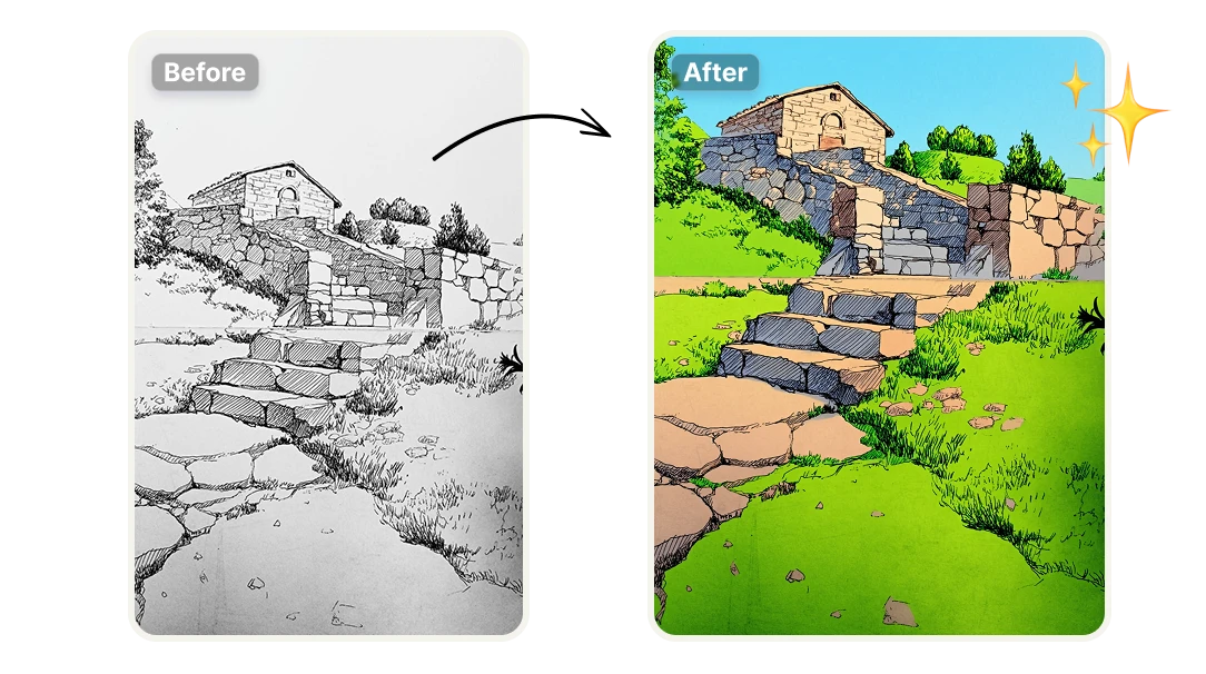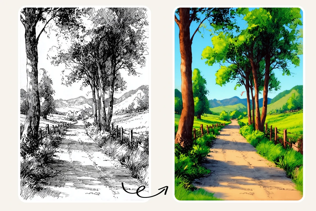 Colorizing landscapes, forests, and natural scenes no longer requires hours of manual painting. With a single click, the AI automatically applies realistic, nature-accurate color—allowing you to move from sketch to colored illustration in seconds.