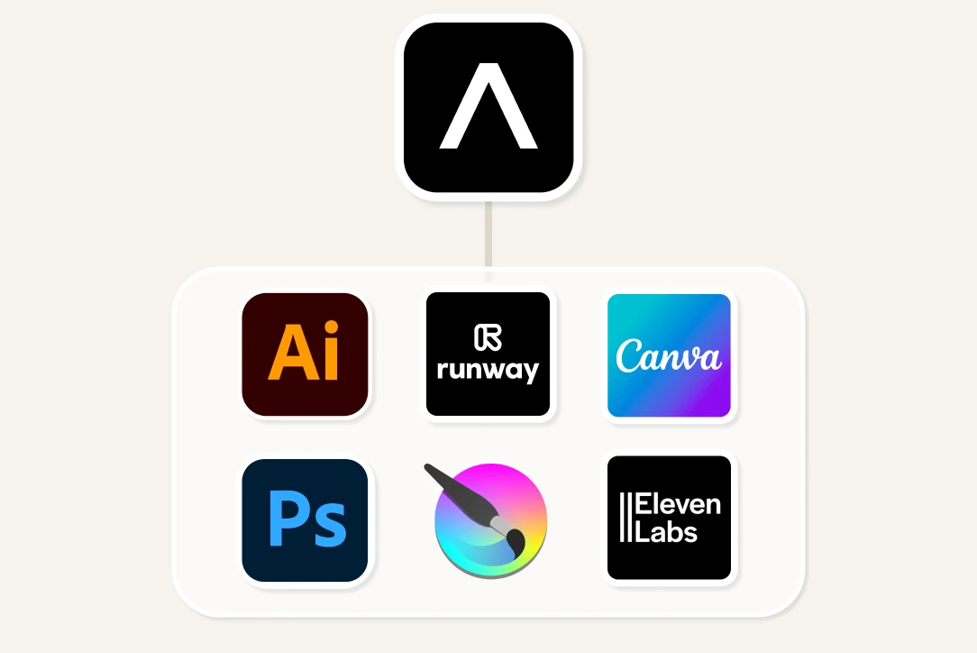 With Artificial Studio, one subscription replaces the four to six separate AI tools most creators rely on to fill Adobe Firefly's gaps. No more juggling Suno for music, ElevenLabs for voice, and Canva for design on top of your Adobe Firefly plan. Track everything you create, manage every format, and deliver every asset from a single platform — at a fraction of the combined cost.