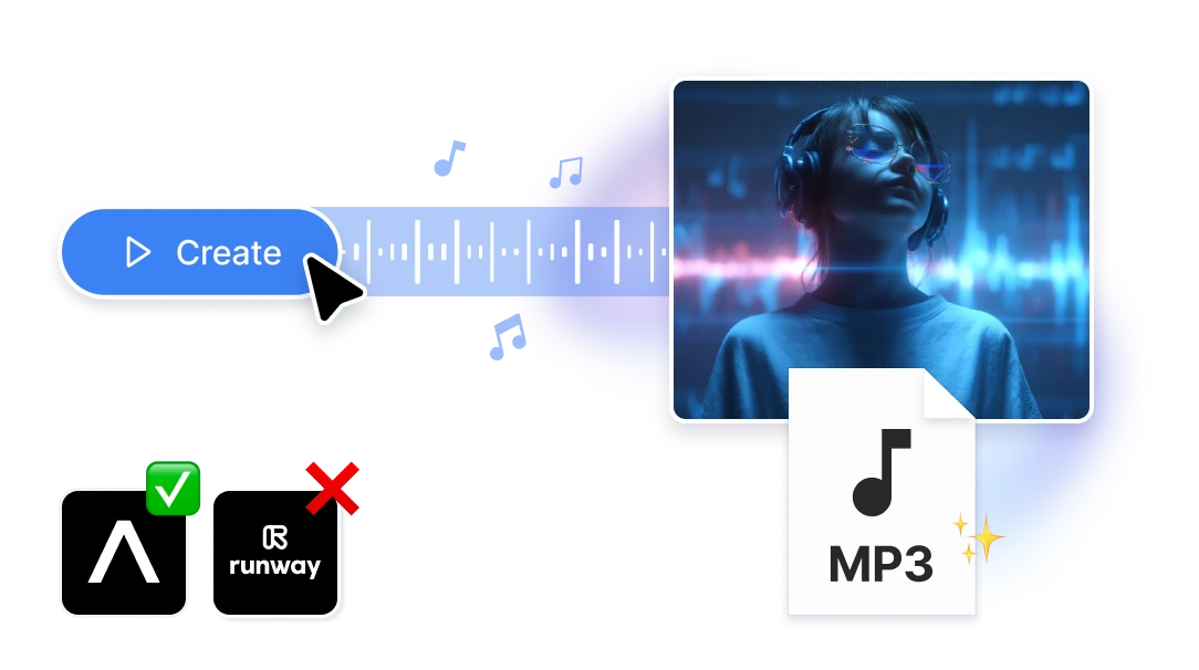 RunwayML includes some audio features within its video workflow, but it's not built as a standalone audio platform. Artificial Studio includes a complete audio toolkit: Create Music, Sound Effects, Text to Speech, Song Splitter, Audio to Text, and Audio to Subtitles — covering the full audio production workflow in one place.