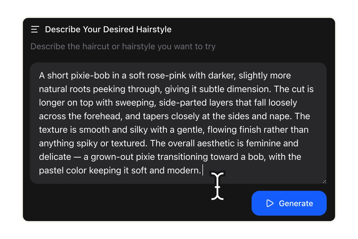 The more specific your description, the more accurate the result. "A short pixie-bob in soft rose-pink with darker roots, side-parted layers falling across the forehead" produces a different result than "short pink hair" — both work. The AI reads natural language and interprets cut, color, texture, and finish together. Fully browser-based, no software to install, results in seconds.