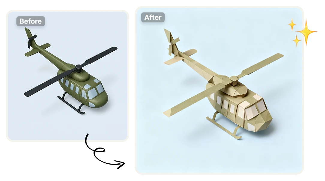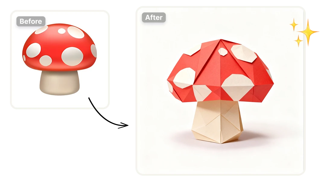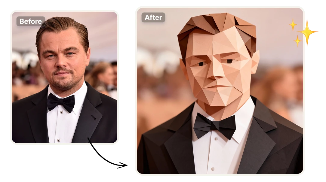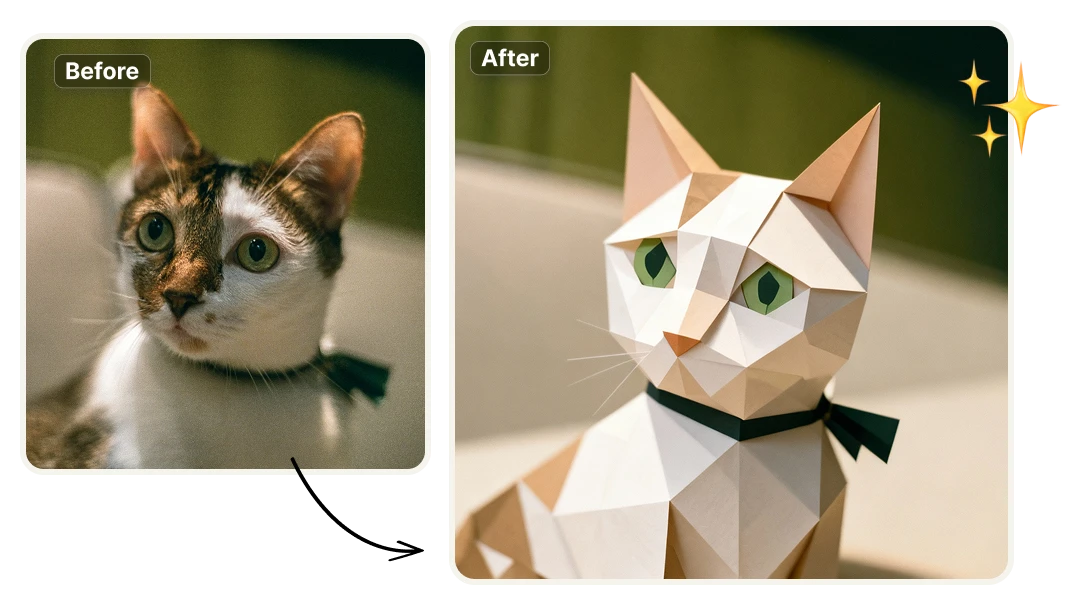 Transform photos into paper-crafted origami artwork with clean folds, geometric planes, and realistic paper texture. Preserve the essence of the original image while turning it into a distinctive, handcrafted-style visual—perfect for social posts, branding assets, posters, and personalized digital art. Create collectible-looking origami pieces in seconds, no design skills required.
