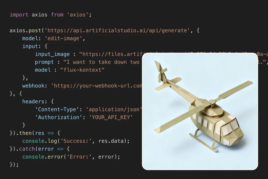 Integrate origami art generation and more than 50 AI tools directly into your product or service using the Artificial Studio API. Automate visual creation, build custom workflows, and offer advanced AI-powered features without managing multiple vendors or models.