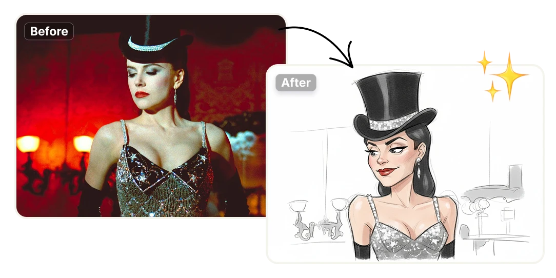 Convert your photo into a vibrant AI-powered cartoon sketch with artistic watercolor textures and playful caricature flair. Choose from multiple styles—watercolor, pastel, ink line art, caricature portrait—and get a unique “photo to cartoon” or “photo to sketch” look without needing any design skills. This sets you apart from basic “cartoon yourself” tools by offering professional-art quality and creative variety.