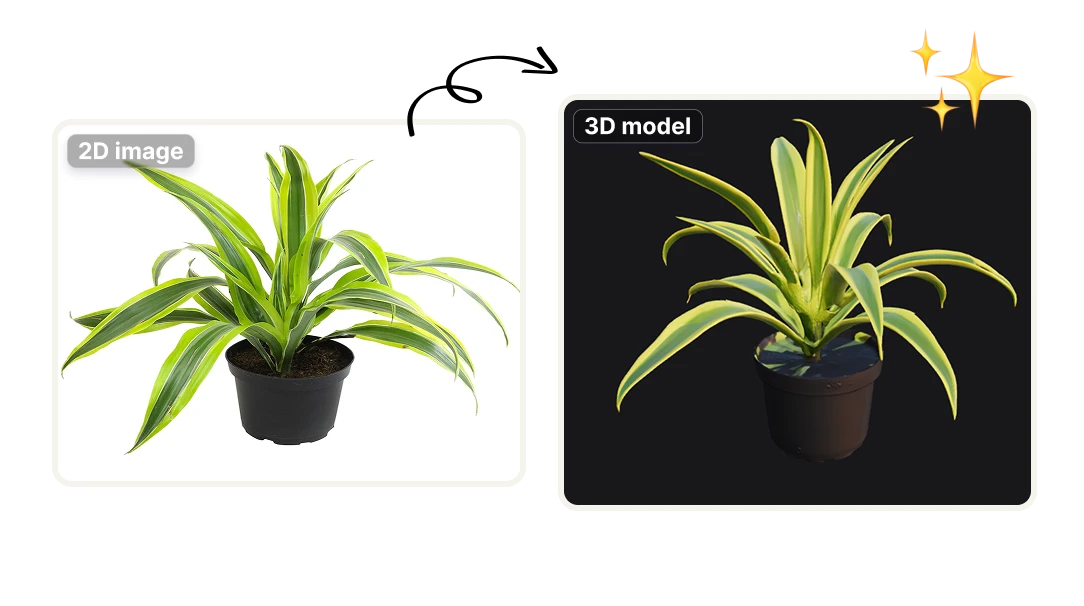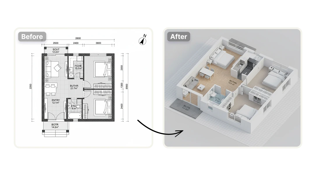 Transform images, drawings, or visual references into 3D elements such as furniture, architectural components, or building concepts. This is especially useful for architectural visualizations, custom interiors, and property marketing materials that require flexible 3D assets without manual modeling.