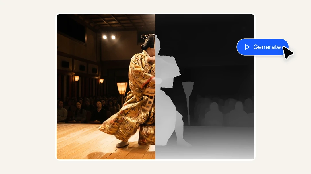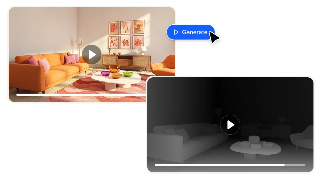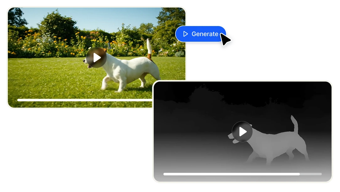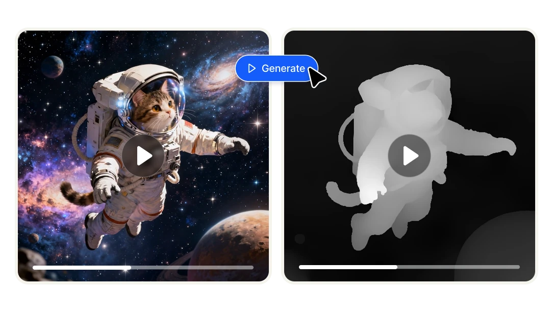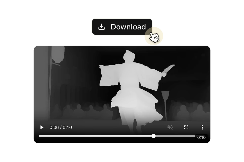 Upload any video and generate a frame-accurate depth map in seconds. Get a grayscale depth pass ready to use in After Effects, Nuke, ComfyUI, ControlNet workflows, and 3D compositing pipelines — no manual rotoscoping, per-frame processing or technical setup required.
