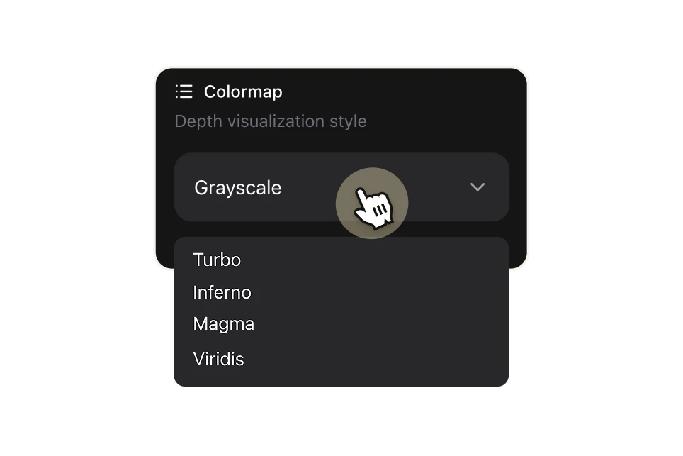 Select how you want the depth information visualized. Grayscale is the standard for VFX and ControlNet pipelines — bright areas are closest to the camera, dark areas are furthest away. For data visualization or creative use, choose from Turbo, Inferno, Magma, or Viridis colormaps, each mapping depth to a distinct color gradient.